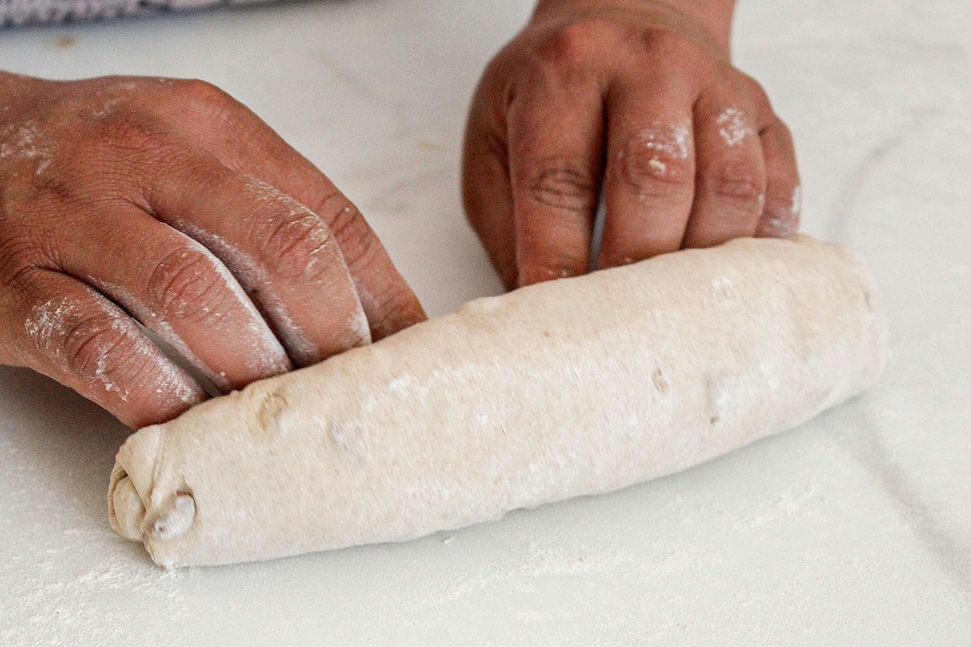 Ingredientes: • 480 g de Masa madre • 1.6 kg de Masa base • Leche evaporada para brillar las piezas terminadas Ingredientes para masa base: • 1 kg de harina de trigo Trigarina o Rendidora • 18 g de sal • 15 g de azúcar estándar • 5 g de mejorante para panificación RendiMix • 600 ml de agua *En caso de desear una fermentación más acelerada, agregar 2 g de levadura seca Preparación de la masa base: 1. Mezclar en la amasadora o batidora (usando el gancho) todos los ingredientes secos hasta incorporar. 2. Agregar el agua y amasar durante 3 minutos o hasta que la masa despegue del cazo. 3. Sacar la masa y cubrir con manta o plástico y reposar durante 30 minutos a temperatura ambiente. Elaboración: 1. Agregar la masa madre a la masa base y refinar hasta obtener una masa elástica y óptimo desarrollo de glúten y bolear. 2. Reposar la masa en bola durante 15 minutos, en seguida dividir la masa para formar 6 tiras de aproximandamente 70 cm de longitud y formar piezas de acuerdo a la secuencia de las siguientes imágenes, posteriormente voltear para fermentar.