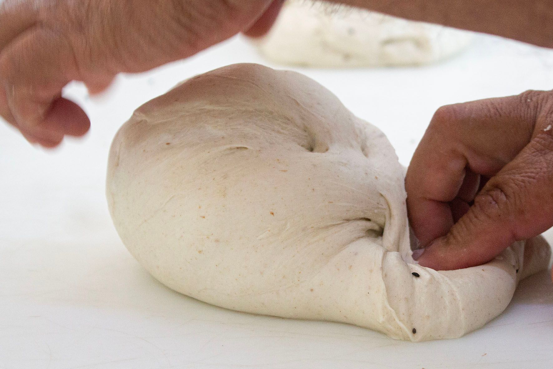 1. Agregar la masa madre a la masa base y refinar hasta obtener una masa elástica y óptimo desarrollo de glúten.